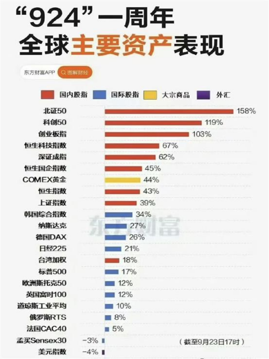 一年前,随着宏观政策的全面转向,我们的股市开始转势向上,逐步成了全球市场中的最亮点。从2024年“924”行情以来,代表中国资产的主要指数,从创业板到科创板,从传统沪深市场到新兴北交所,均处于全球遥遥领先地位。(如下图,东方财富网数据)