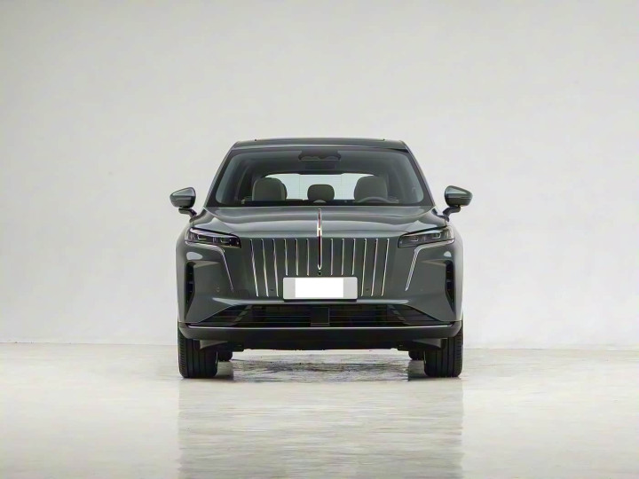 我们首先来看新车的外观设计方面,新车的前脸采用封闭式高山飞瀑格栅设计,12根镀铬饰条与红色旗标灯构成视觉中轴线,既延续红旗家族基因又彰显新能源身份。龙睛LED大灯组集成竖向日行灯与7字形灯带,配合前包围贯穿式镀铬饰条,拉伸横向视觉宽度达1.97米。蚌壳式引擎盖棱线强化力量感,前翼子板导流槽设计降低风阻系数,兼顾美学与空气动力学。