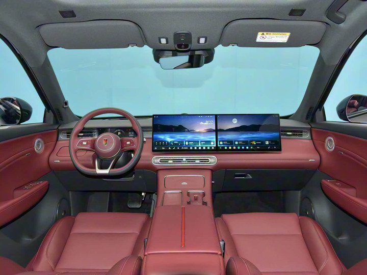进入车内,新车黑红双拼色的内饰整体更具运动感,并且中控台配备了三屏联动系统:12.3英寸仪表盘+16.2英寸中控屏+副驾娱乐屏组成一体式联屏,支持分屏操作与HUD抬头显示,配备的旗偲1.0系统,而且语音控制覆盖座椅调节、冰箱开关等200+功能,面部识别实现个性化设置。副驾座椅带有8向电动调节带腿托,慢回弹发泡材质降低长途疲劳,而车载冰箱支持-6℃至50℃温控范围,可容纳6瓶500ml饮品。